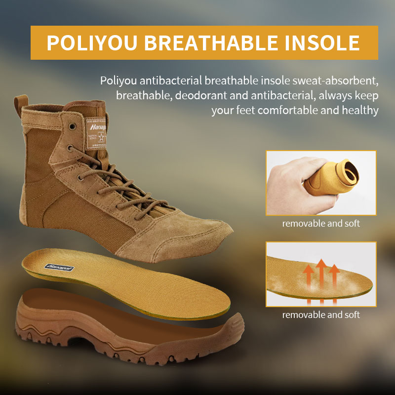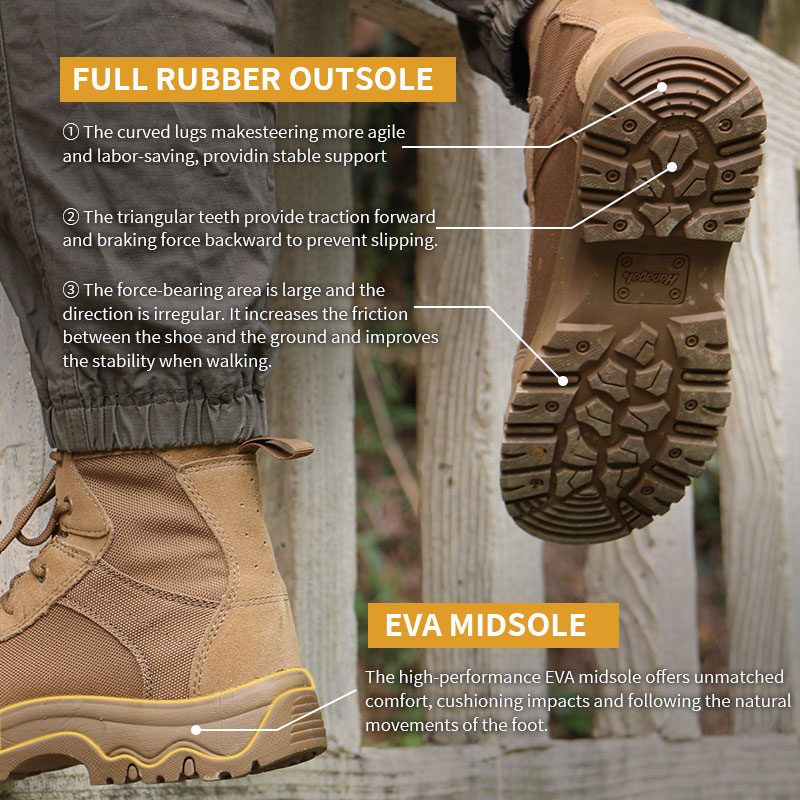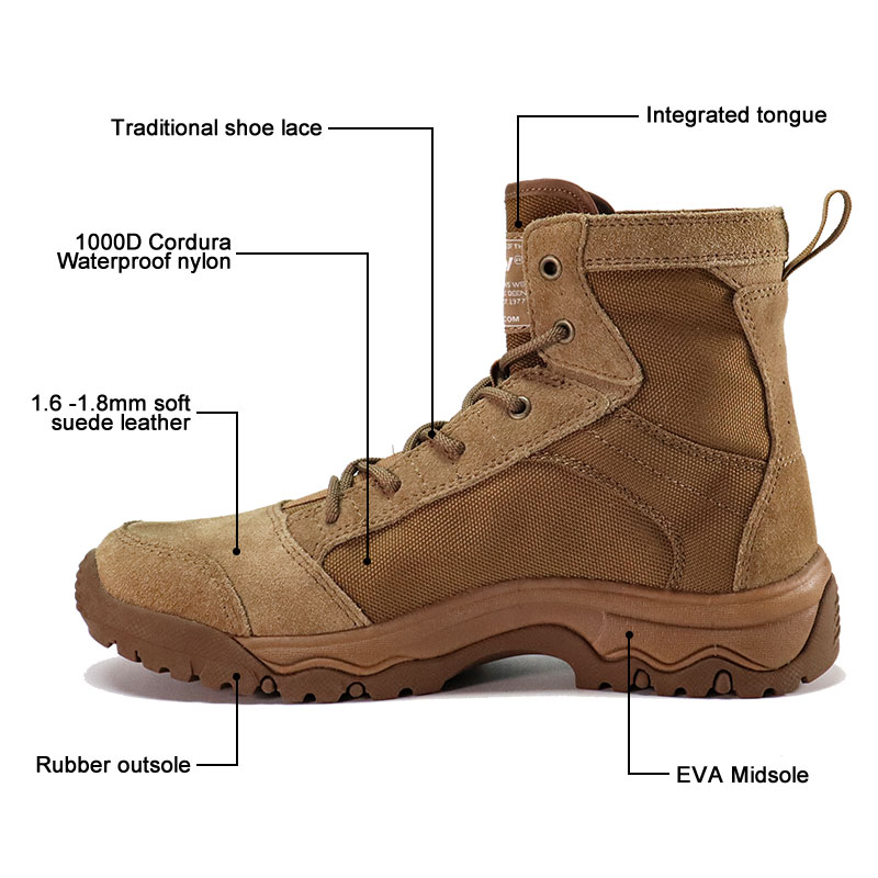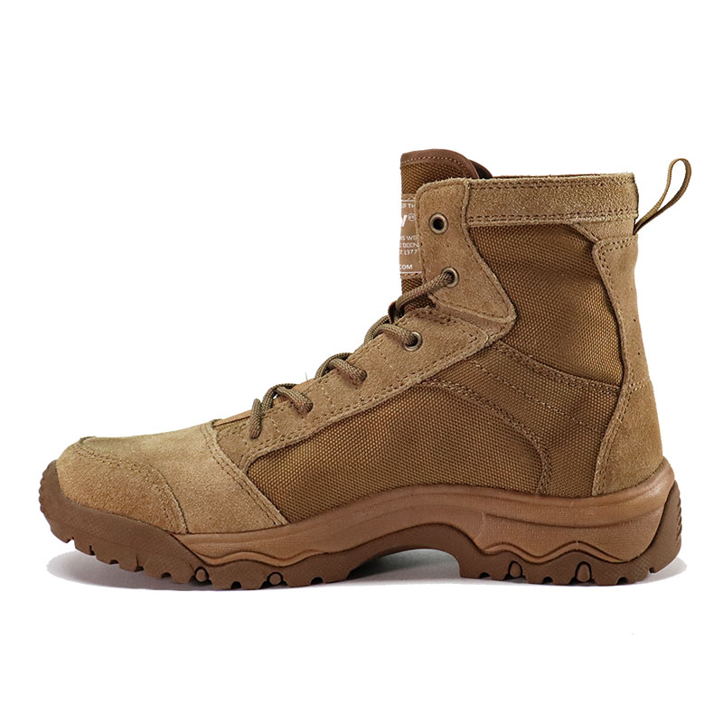 Dagli uadi rocciosi alle dune di sabbia sciolte, gli stivali tattici da deserto in gomma e tessuto Cordura sono progettati per funzionare. La resistente tomaia in Cordura resiste all'usura mantenendo basso il peso, e la suola in gomma multidirezionale fornisce un appoggio stabile su superfici imprevedibili del deserto. Inviaci una richiesta per ulteriori informazioni.