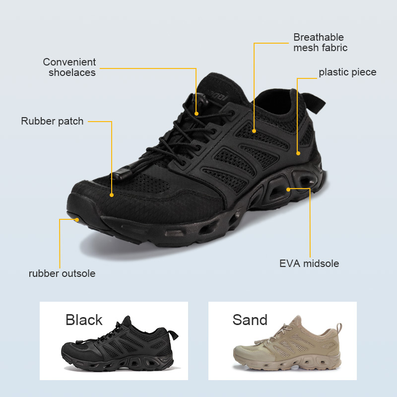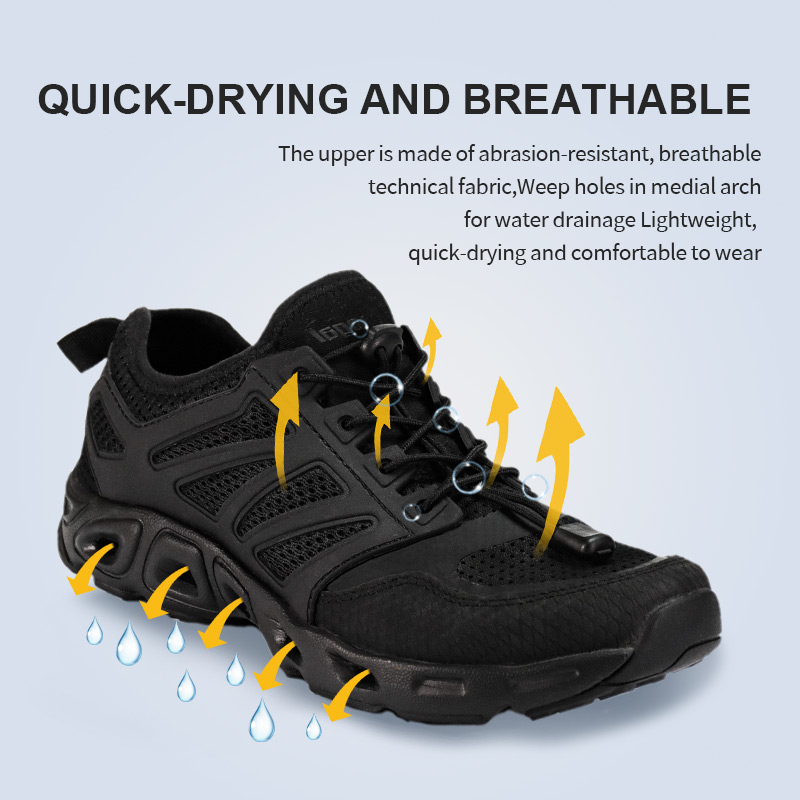 -Leggero e traspirante -Drenaggio e asciugatura rapida -Intersuola ammortizzante in EVA -Comodo design dei lacci delle scarpe