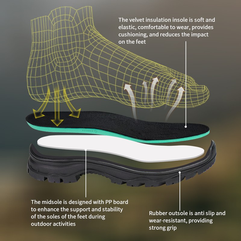 ①Fodera in velluto. Morbido sotto i piedi. Assorbe l'impatto. ②Intersuola in PP per un supporto stabile. ③Suola in gomma che non lascia andare. Afferra, dura, rimane affidabile.