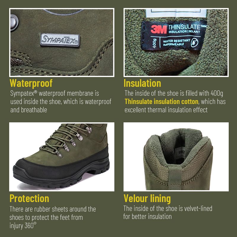 Questi stivali da caccia Sympatex con isolamento impermeabile Thinsulate sono disponibili per la personalizzazione in colori, materiali e dettagli, con un MOQ di 800 paia, ideali per collaborazioni con marchi e appalti di gruppo. E questi stivali da caccia presentano i seguenti vantaggi: